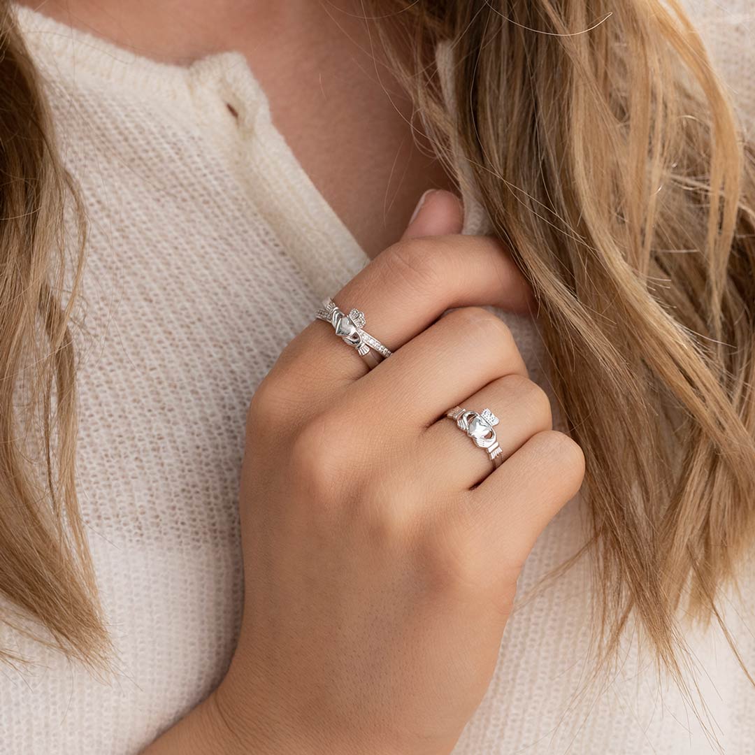 This stunning sterling silver Claddagh ring with cubic zirconia is formed in a modern crossover shape, resembling the shape of a kiss. The Claddagh’s symbols represent love (heart), friendship (hands) and loyalty (crown), and echo the words of the Irish sailor who first crafted it for his sweetheart: “With these hands I give you my heart, and I crown it with my love”. This sterling silver ring with crystal is Irish hallmarked by the Assay office in Dublin Castle.